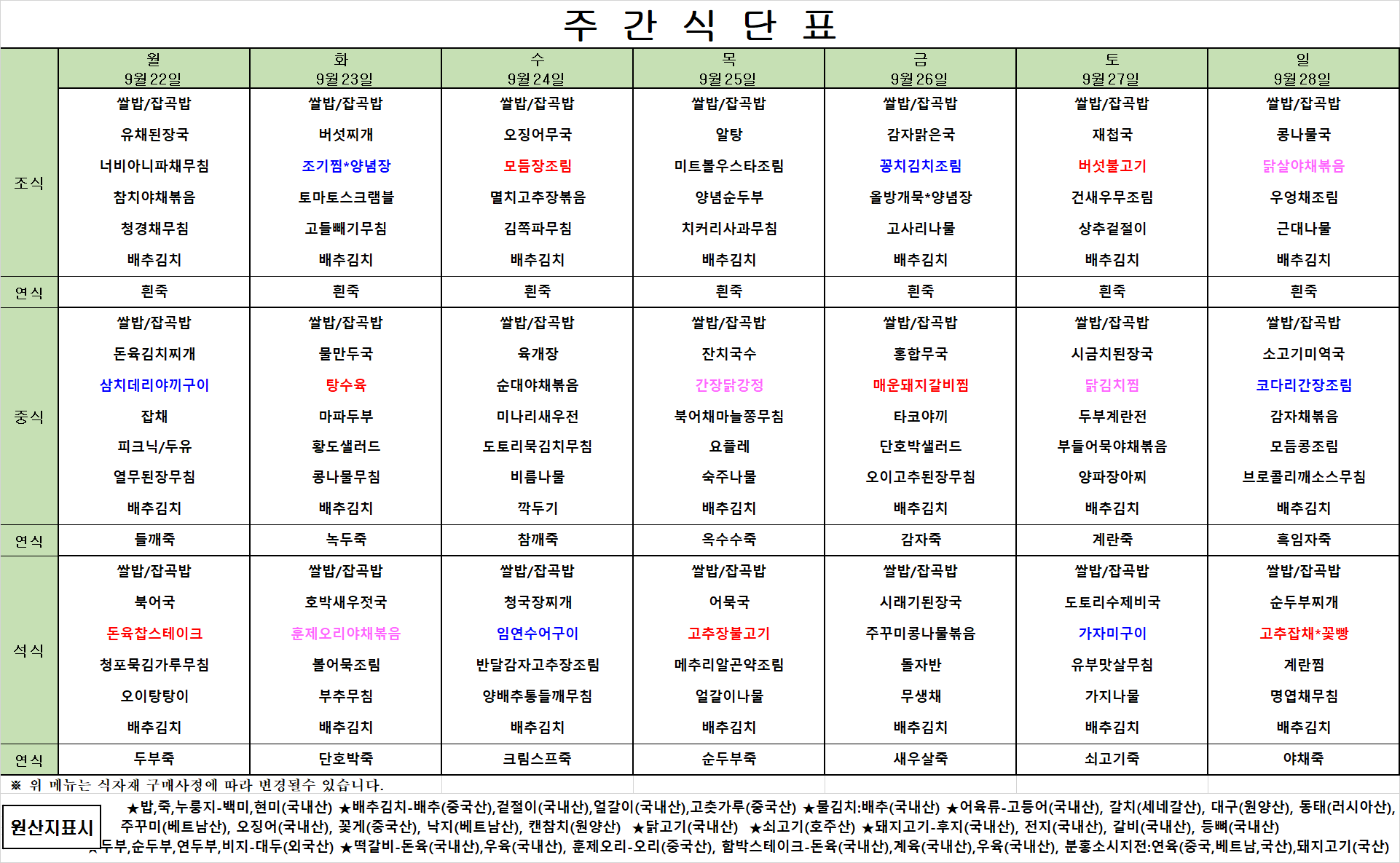 9월 3주차 식단표