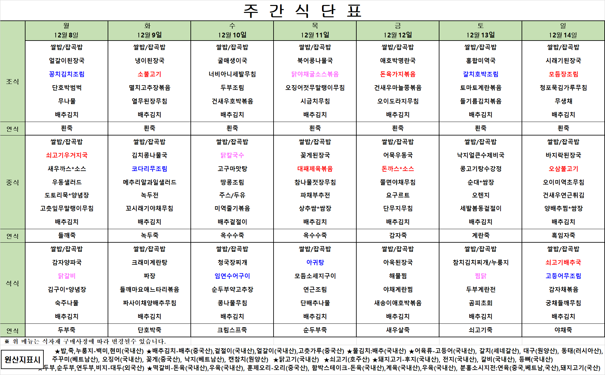 12월 2주차 식단표