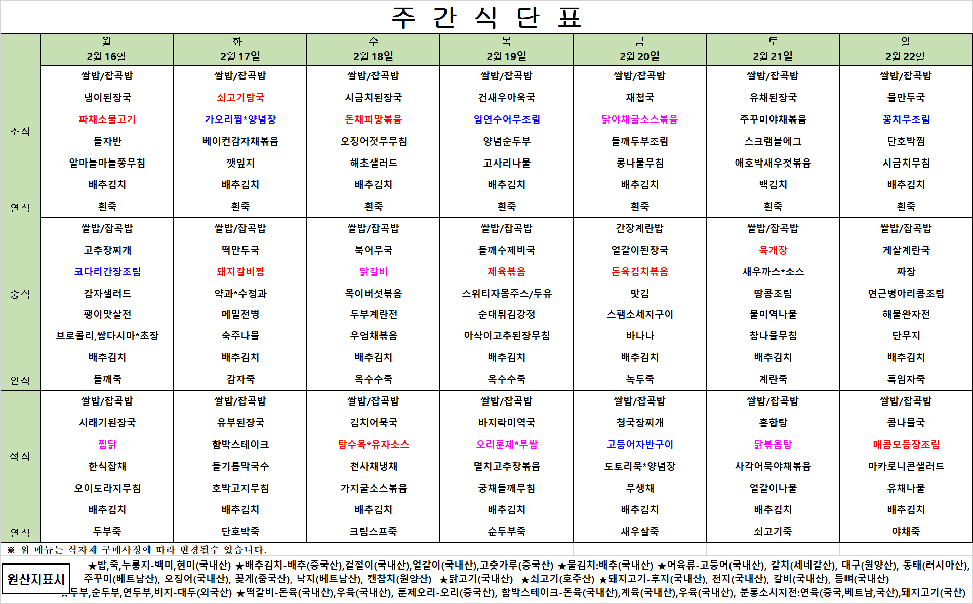 2월 3주차 식단표
