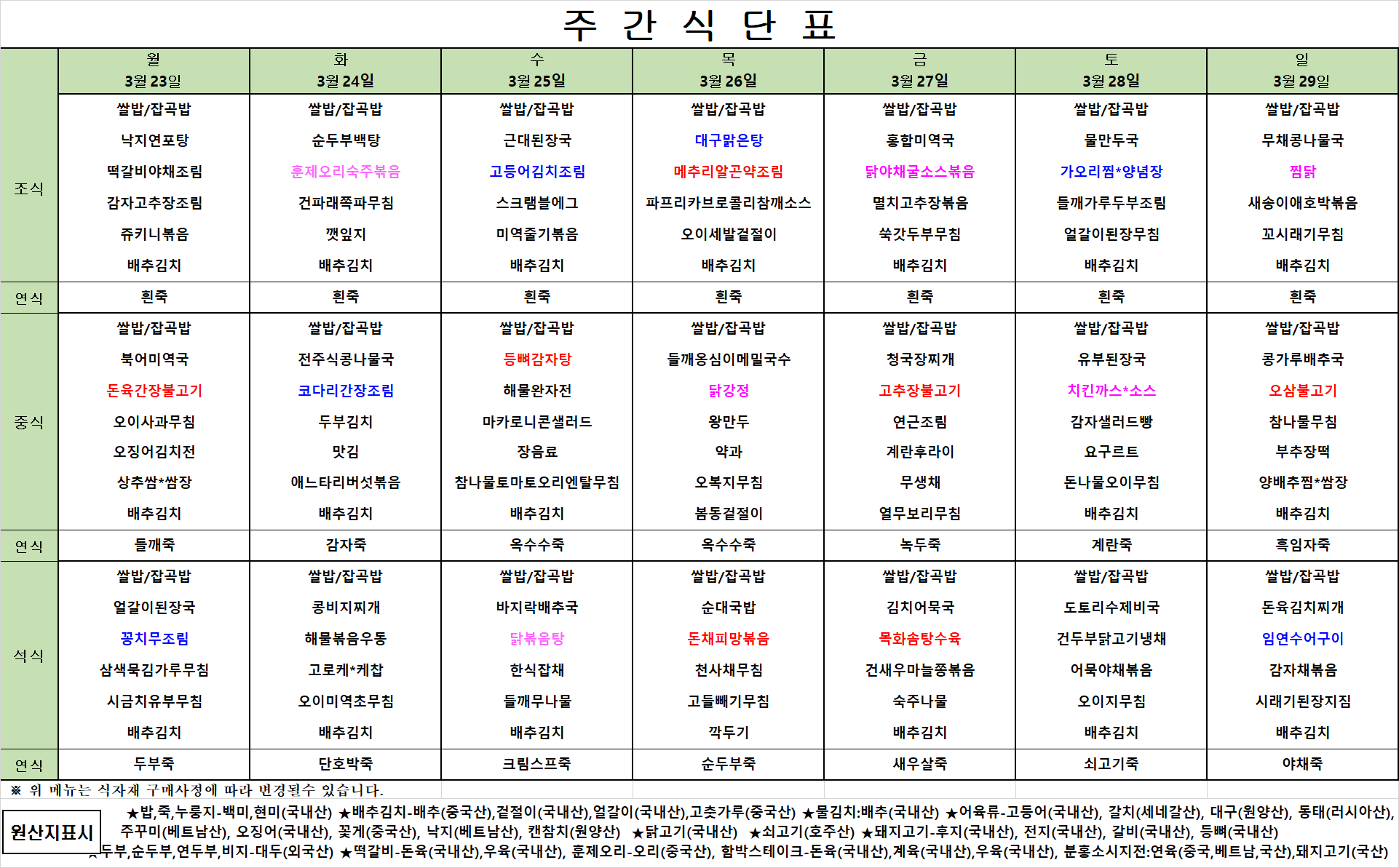 3월 4주차 식단표