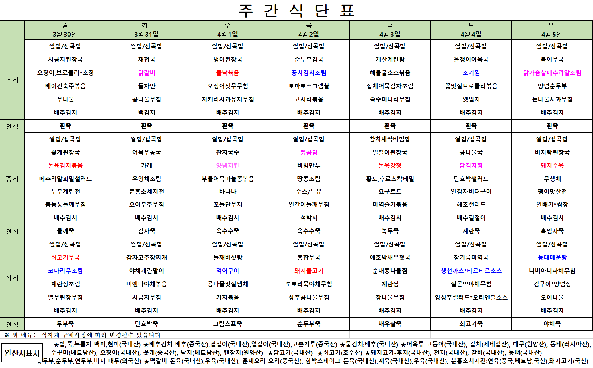 4월 1주차 식단표